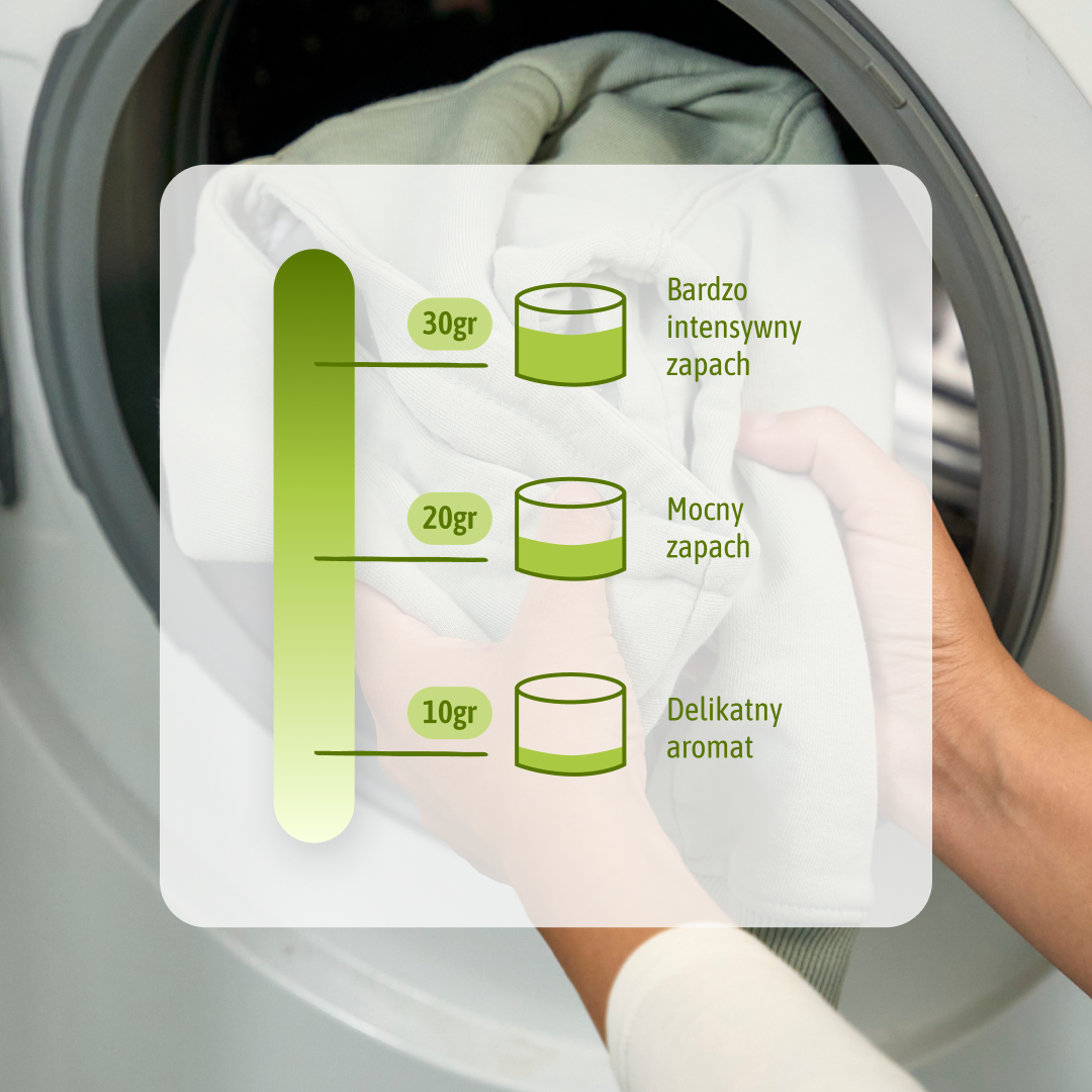 1. Dostosuj ilość do swoich preferencji zapachowych – jeśli wolisz delikatny aromat, wystarczy 10 g. Lubisz intensywnie pachnące pranie? Użyj 20 g lub więcej!