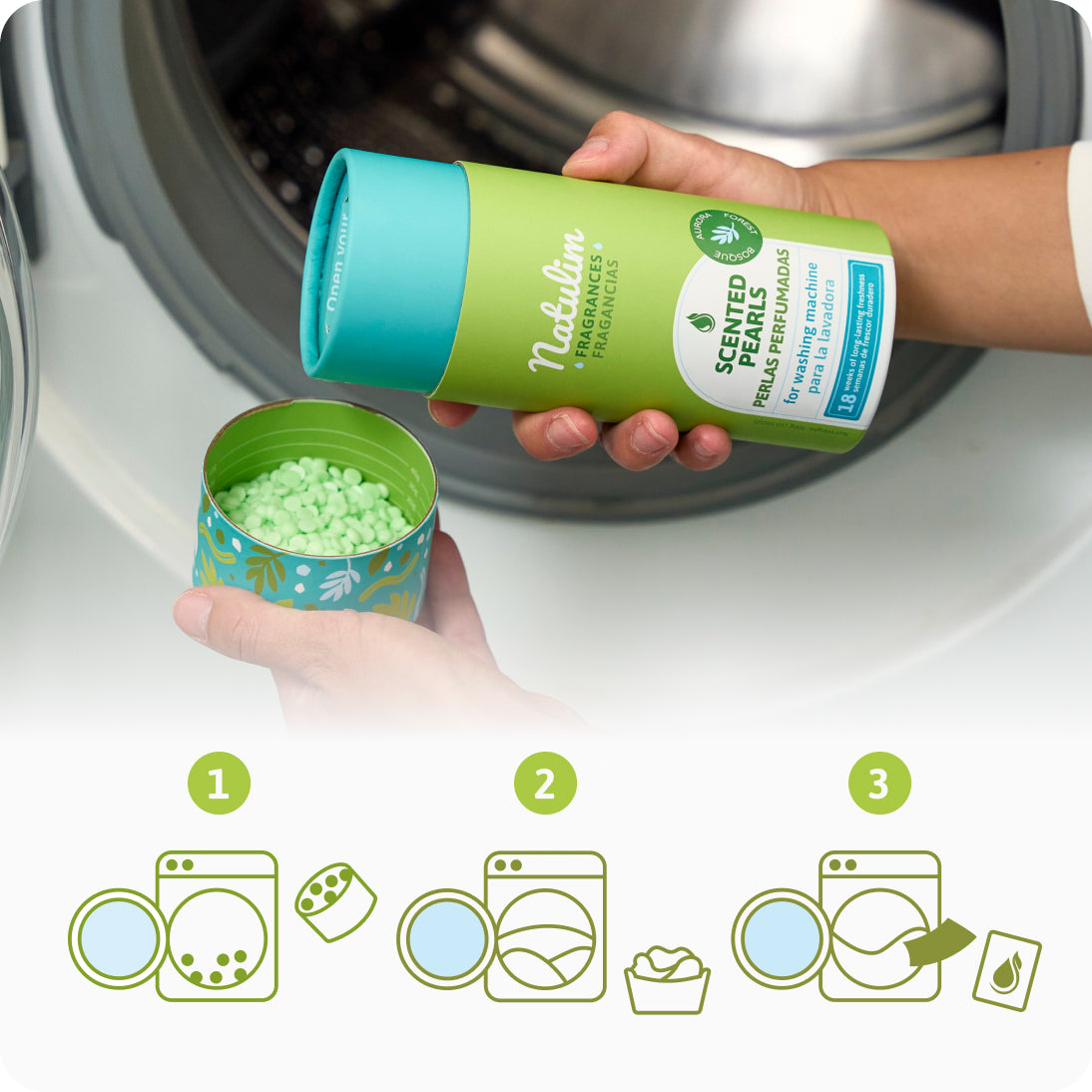 2. Wsyp perełki bezpośrednio do bębna pralki, przed włożeniem ubrań. Dzięki temu każda tkanina przesiąknie zapachem.