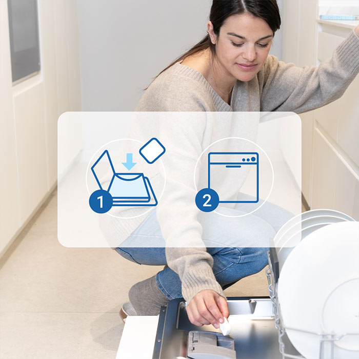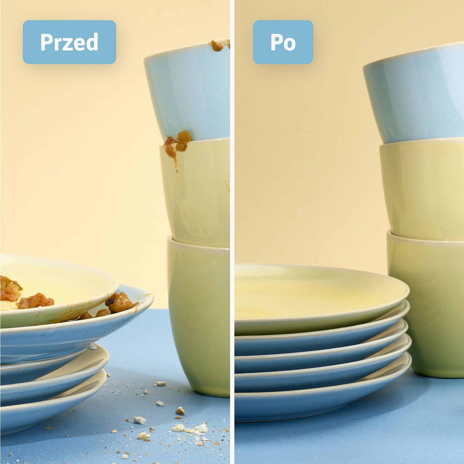 Dodaj jedną tabletkę na jeden cykl mycia niezależnie od wielkości wsadu i stopnia zabrudzenia.